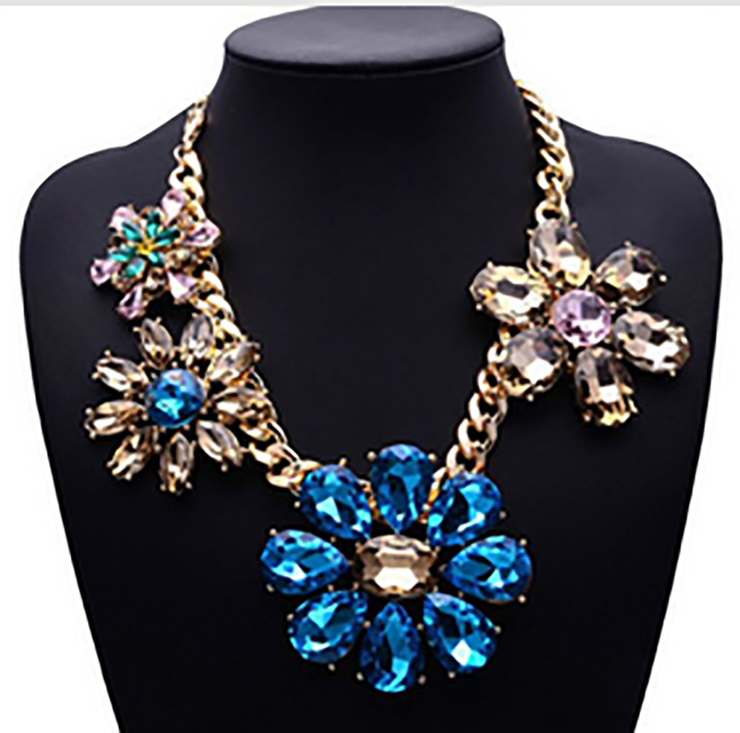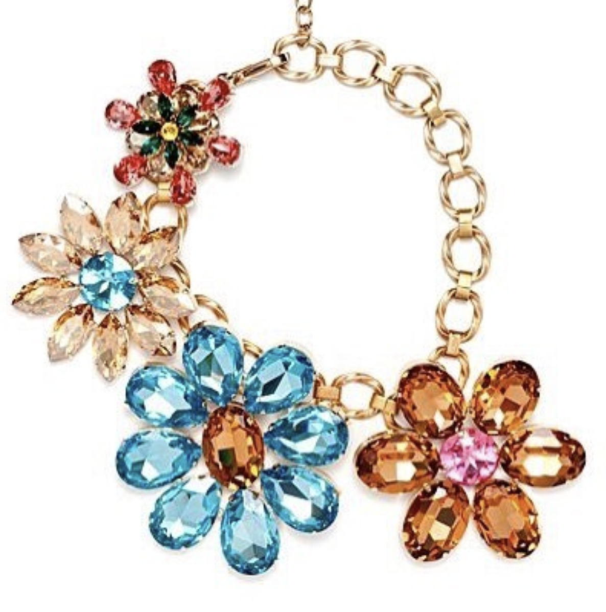 This piece is so feminine. What a better way than to adorn oneself with chunky rhinestone flowers.